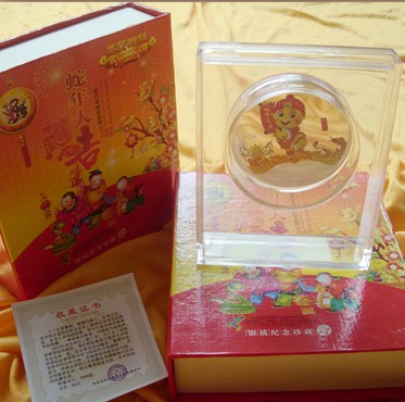 十二生肖之--------------------蛇年彩银纪念章 该纪念章主题内容洋溢着祥和喜庆的气氛,是工艺收藏品和馈赠海内外亲友的高尚礼品! 规格:直径6CM 80克