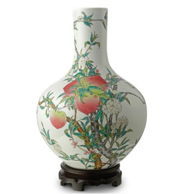 原物藏于北京故宫博物馆。 天球瓶是从丰满的圆形瓶身,引出一个短颈而得名。胎体洁白,釉质粉润如雪,胎釉浑然一体,修胎极为规整。用粉、绿、白、褐等色,用没骨画法在瓶体上绘出浓淡相间层次清晰而富立体感的桃树、月季各一株。桃干茁壮,枝头结蟠桃9个,果实饱满,枝叶葳蕤。树旁衬月季,轻盈俏丽。此瓶造型秀美,花纹朗,清新悦目。本公司精仿的此件产品,是2005年5月我国国家政协主席贾庆林送给台湾宋楚瑜先生的国礼。