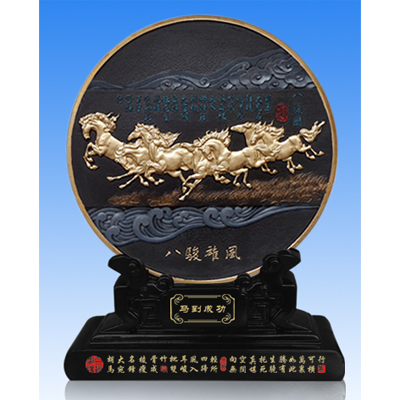 【 产品规格】:φ圆盘直径260MM 【产品名称】:新款八骏雄风(带金边) 【工 艺】:浮雕、彩绘 【零售价格】:598元 【备 注】:背面可加LOGO印字,底座可以印字