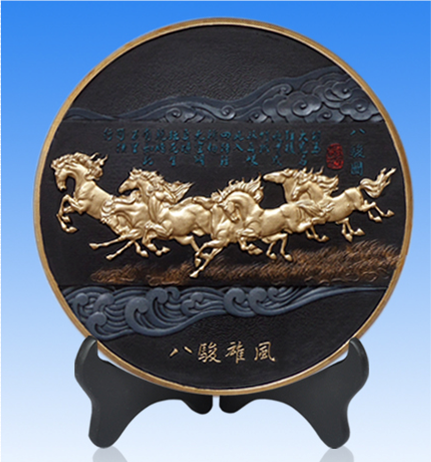 新款八骏雄风(金边) 【 产品规格】:φ圆盘直径260MM 【产品名称】:新款八骏雄风(带金边) 【工 艺】:浮雕、彩绘 【零售价格】:598元 【备 注】:背面可加LOGO印字,底座可以印字