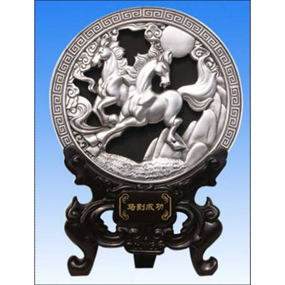 【 产品规格】:φ圆盘直径220MM 【产品名称】:马到成功手雕款 【工 艺】:浮雕、彩绘、精雕手雕 【零售价格】:498元 【备 注】:背面可加LOGO印字,底座上可以印logo